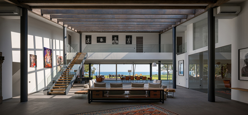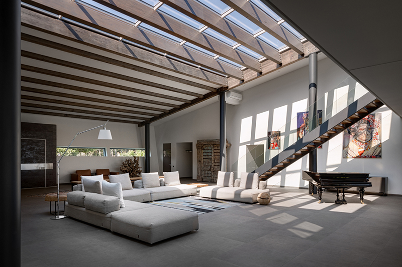 Bên trong, không gian nhà mở, nhận đầy ánh sáng và gió trời thông qua cửa kính.