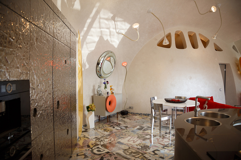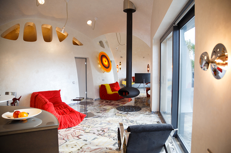 Căn nhà không có bức tường nào thẳng. Trần cao tối đa 5 mét, diện tích sử dụng là 100 m2.